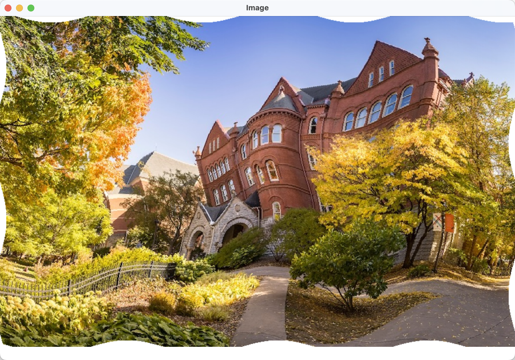 We are going to write code that takes an input image, reshapes and distorts it, and then displays the resulting image. How will we do the reshaping? By looping over all the pixel coordinates of the output image, and asking for each one: “What input image coordinates should this pixel come from?”